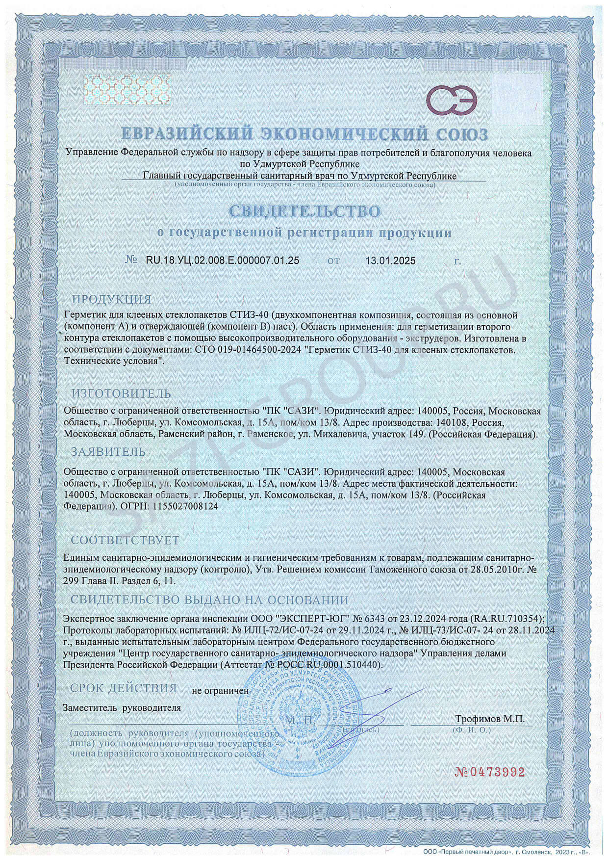 • Свидетельство о госрегистрации Свидетельство о госрегистрации Сазиласт 24 Классик Свидетельство о госрегистрации Сазиласт 24 Классик